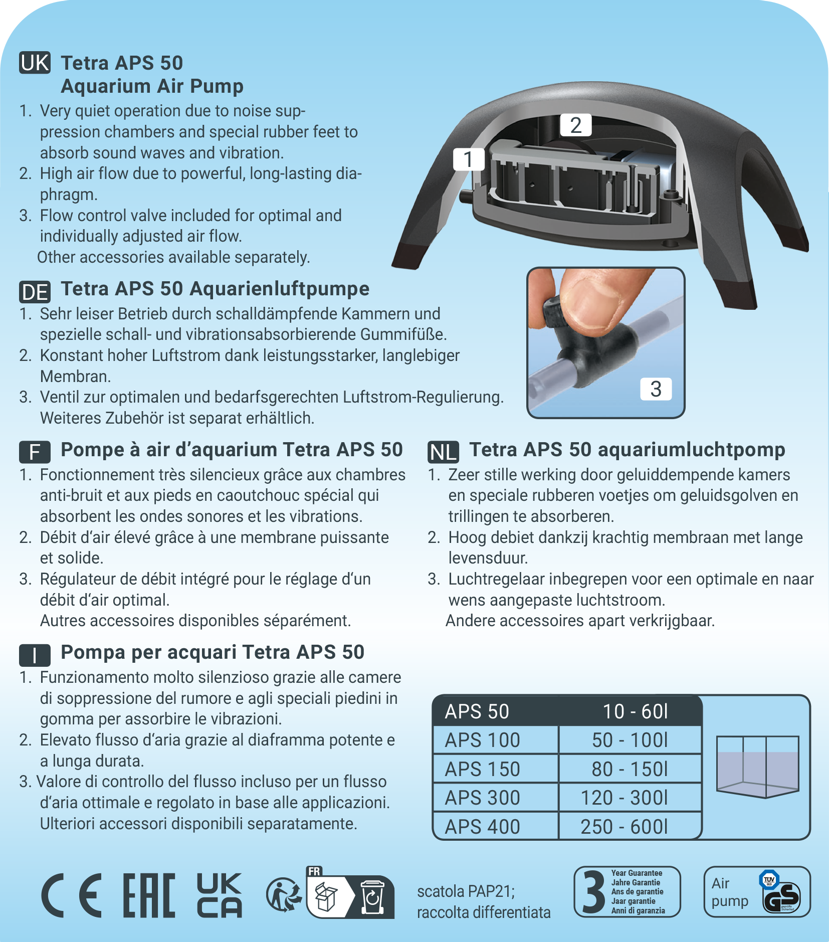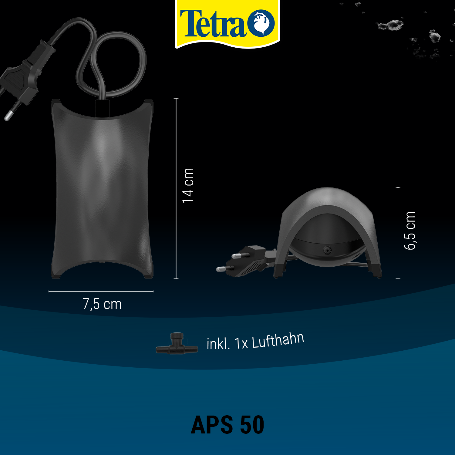 Zračna pumpa za akvarij neophodna je za rad spužvastih filtara na zračni pogon ili za povećanje sadržaja kisika kroz povećano kretanje površine. Tetra APS akvarijska zračna pumpa je vrlo tiha i iznimno snažna zračna pumpa koja zahvaljujući komorama za upijanje zvuka radi vrlo tiho. Zahvaljujući inovativnom dizajnu pumpe s jakim stijenkama kućišta i posebnim gumenim nogama koje apsorbiraju vibracije, moguć je vrlo tih rad. Tetra APS zračna pumpa impresionira iznimnom kvalitetom i pouzdanošću te nudi konstantno visok protok zraka kroz izdržljivu i jaku dijafragmu. U pakiranju je uključena zračna slavina za kontrolu protoka zraka. Rad je izuzetno jednostavan. Zračna pumpa za akvarij Tetra APS testirana je TÜV/GS i ima CE certifikat te 3 godine jamstva.