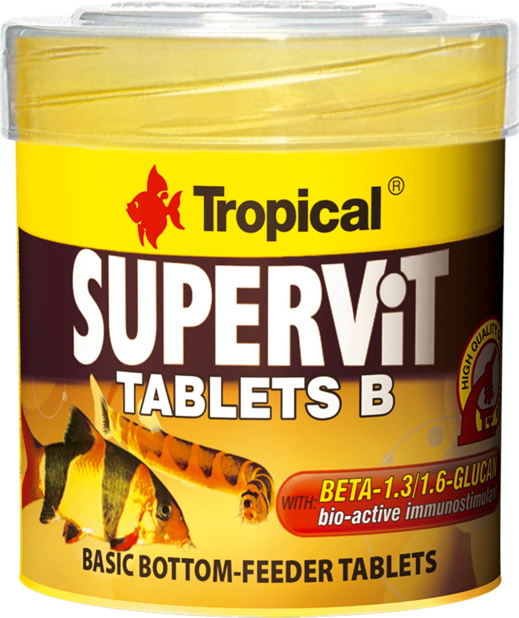 SUPERVIT TABLETE B je višesastojna glavna potpuna hrana za pridnenu hranidbu u obliku tableta, izrađena od apsolutno kvalitetnih prirodnih sastojaka. Tablete su prikladne za svakodnevno hranjenje svih akvarijskih riba koje se hrane na dnu, kao i kornjača i puževa. Posebno se preporučuju za hranjenje mlađih riba u rastu.